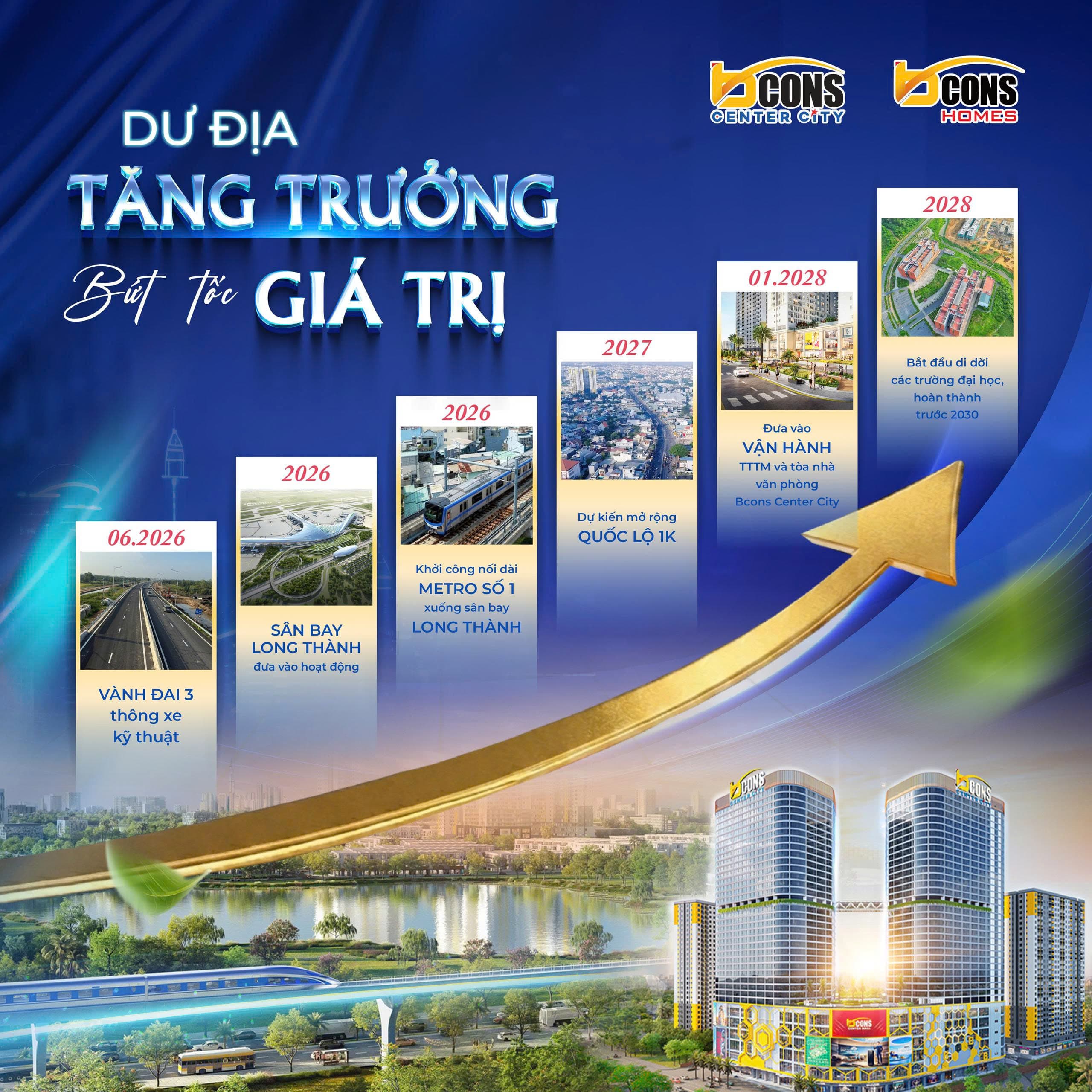 Tọa lạc tại khu vực hội tụ các trục hạ tầng chiến lược, Bcons Center City không chỉ hưởng lợi trực tiếp từ các công trình giao thông, mà còn từ sự hình thành của một trung tâm đô thị – giáo dục – thương mại mới.